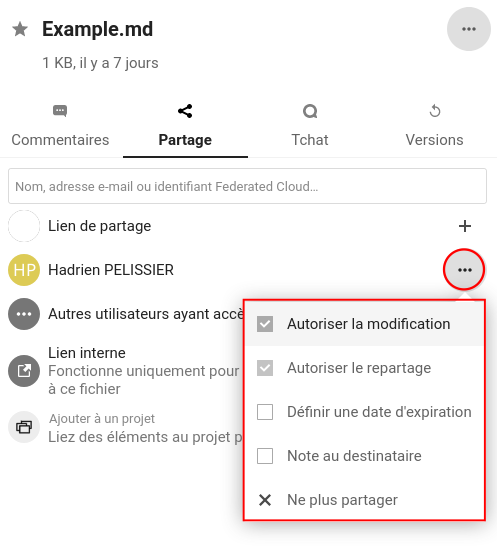 Par défaut, les destinataires d'un partage interne ont la possibilité de modifier et repartager le contenu du document ou du dossier partagé. Il est possible de modifier ces autorisations.