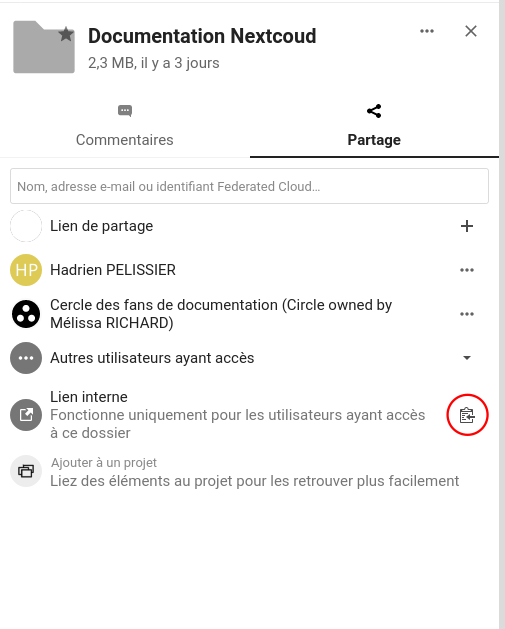 Une fois le partage effectué, les destinataires retrouvent le document ou le dossier dans leur espace personnel. Il est aussi possible de leur communiquer un lien interne, permettant l'accès direct. Pour générer ce lien :