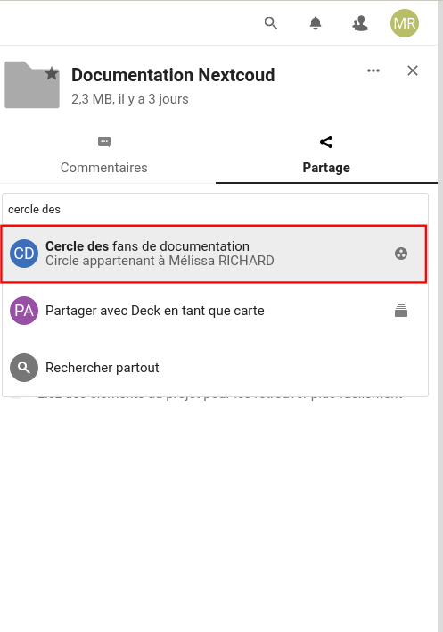 Dans le champ de saisie commencez à écrire le nom de la personne ou du cercle à qui vous voulez partager votre fichier.